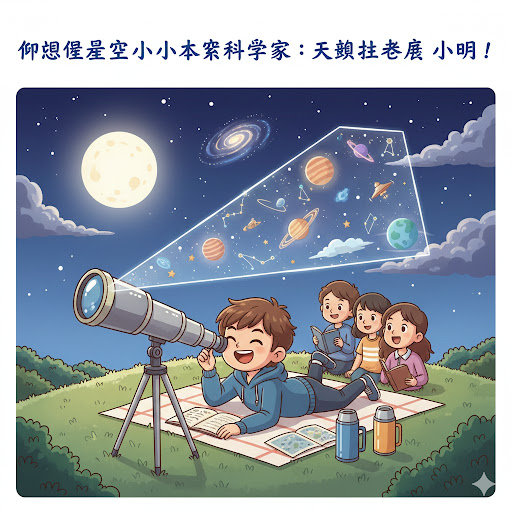 小明也是學校天文社的成員,他熱愛觀星,對浩瀚的宇宙充滿無限的想像。每個週末,他都會帶著他的望遠鏡到郊外,靜靜地欣賞夜空中的星辰。他夢想著有一天能成為一名太空科學家,親自探索宇宙的奧秘。