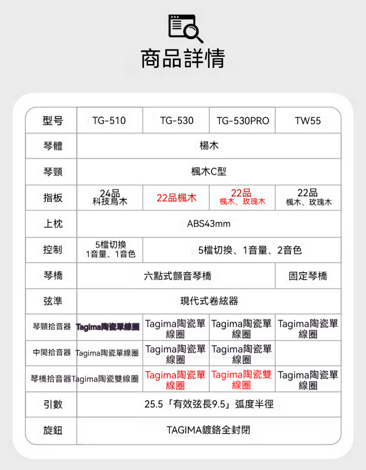 - 拾音器:單單單(Tagima 3單線圈陶瓷磁鐵)