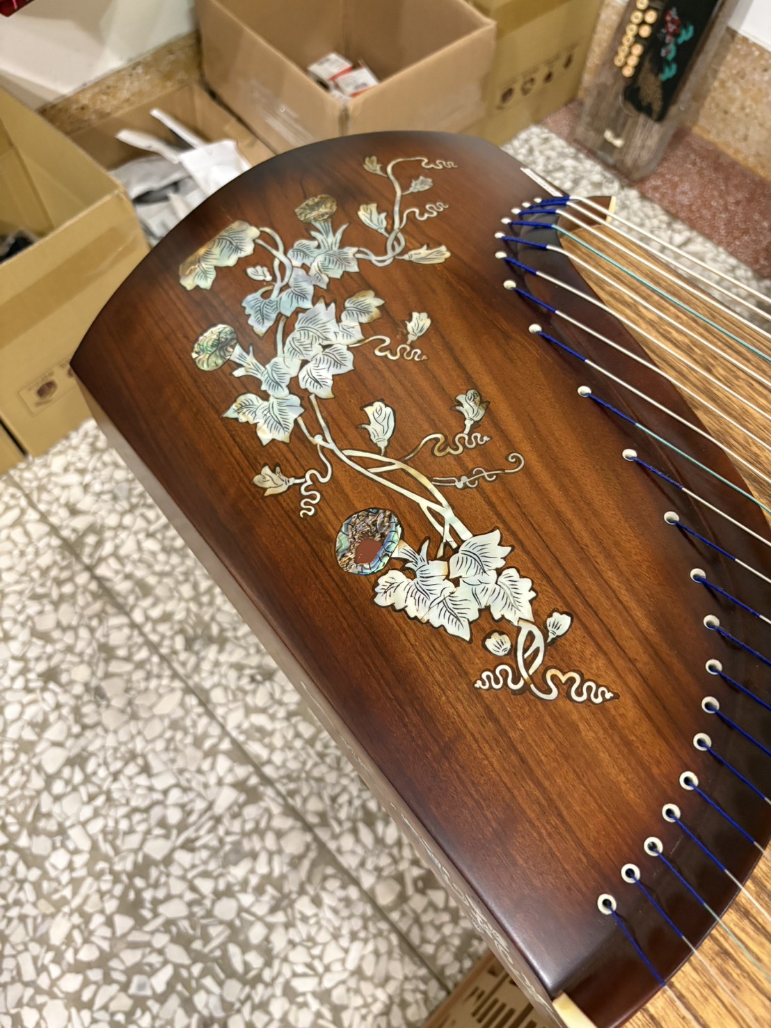 🎨貝殼鑲嵌工藝:琴身兩端飾板皆採用精緻的螺鈿工藝(貝殼鑲嵌),呈現對稱的葫蘆藤蔓圖案。