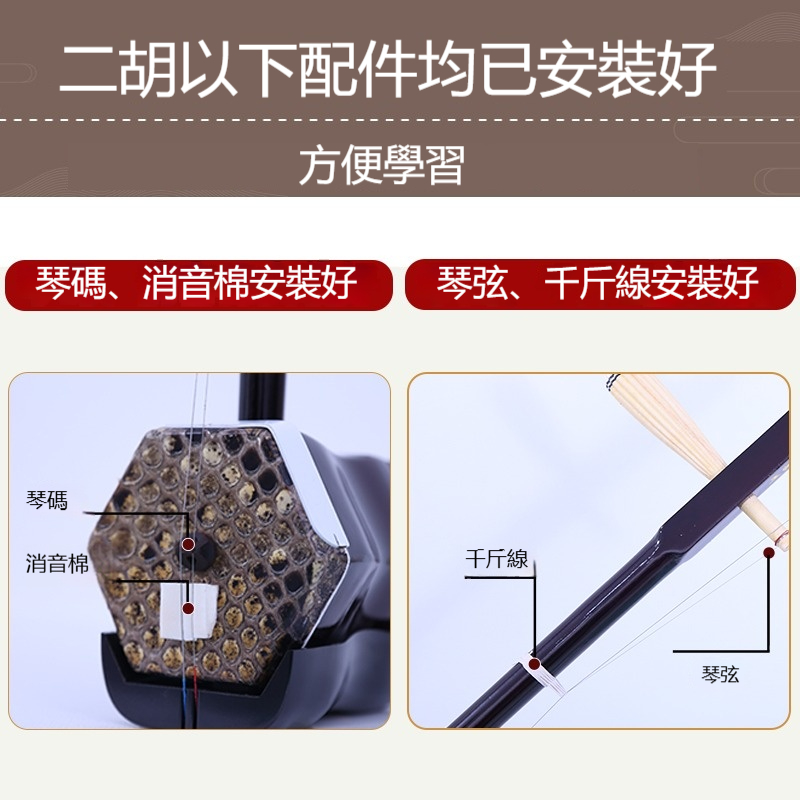 內含二胡本體、弓、松香、琴袋(實際依賣場配置),開箱即可開始練習。😊 外觀典雅,國樂風格十足