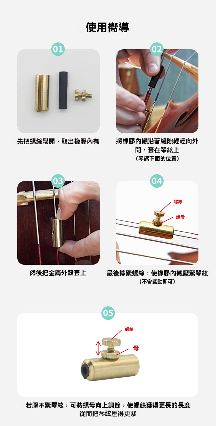 • 安裝簡單,只需固定在 C 弦靠近琴碼的位置