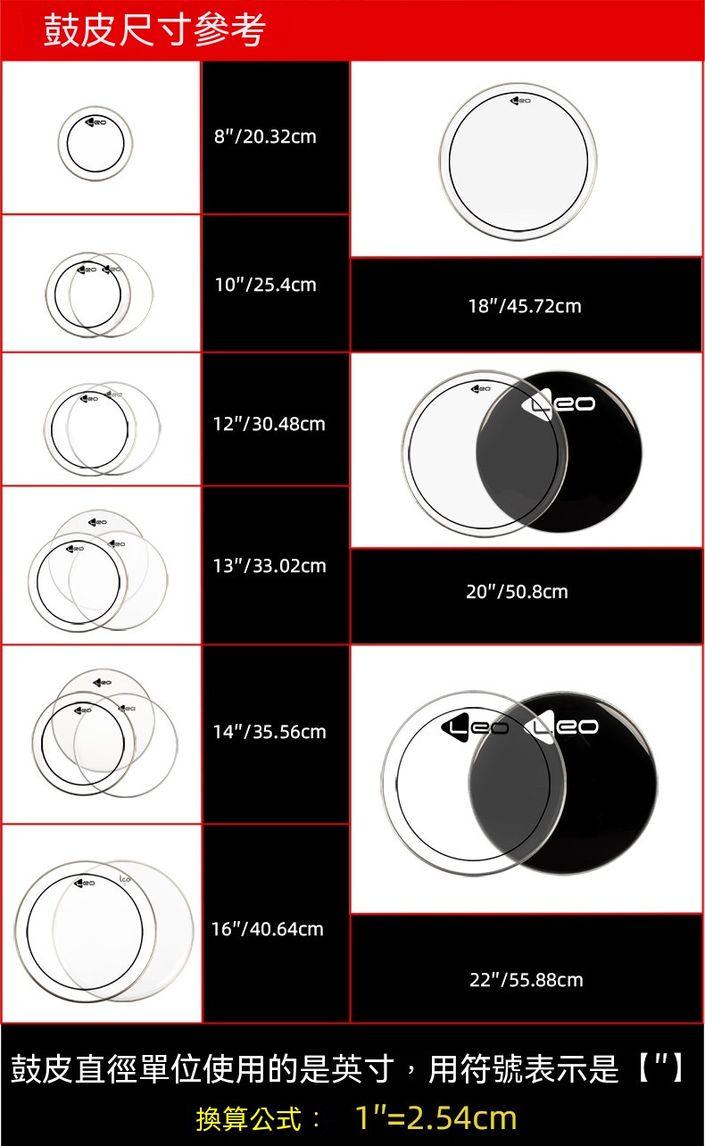 💡 尺寸測量:請務必於購買前自行測量您鼓框的實際尺寸(例如:10吋、12吋、14吋、22吋等),以確保選購正確的鼓皮。