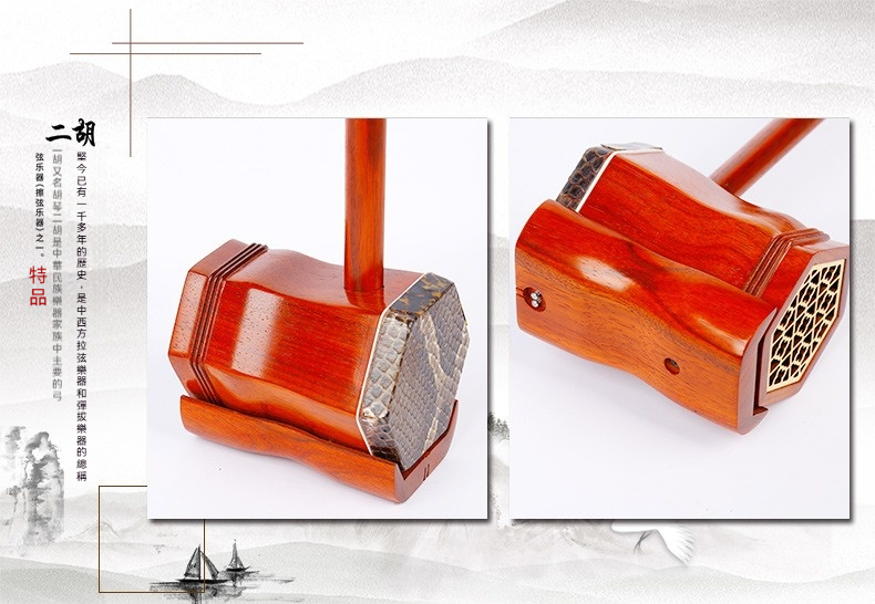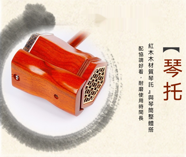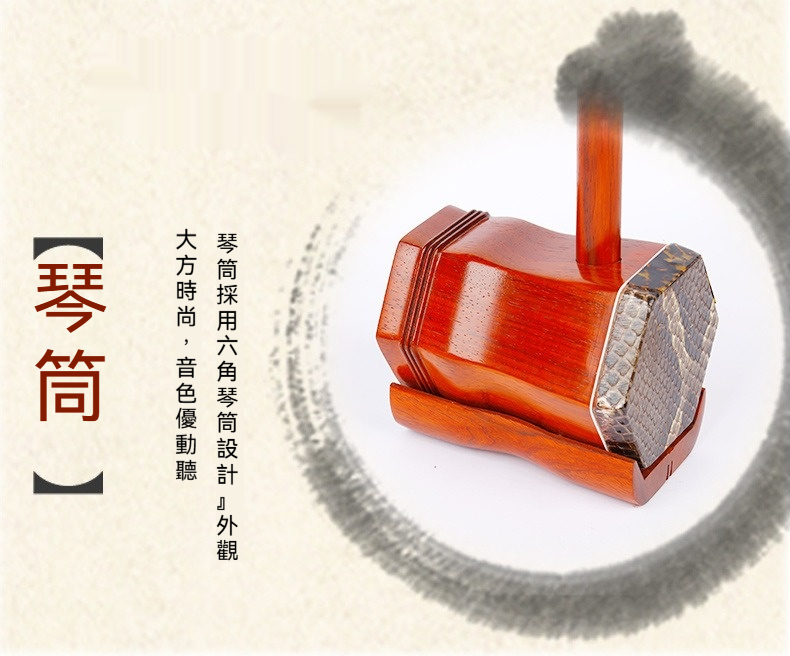 這款精選紅花梨木二胡,以其獨特的甜美音質與亮麗木紋著稱。堅持「素桿」設計,捨棄多餘裝飾,將紅花梨木最原始的細膩質感與優雅色澤完美呈現。
