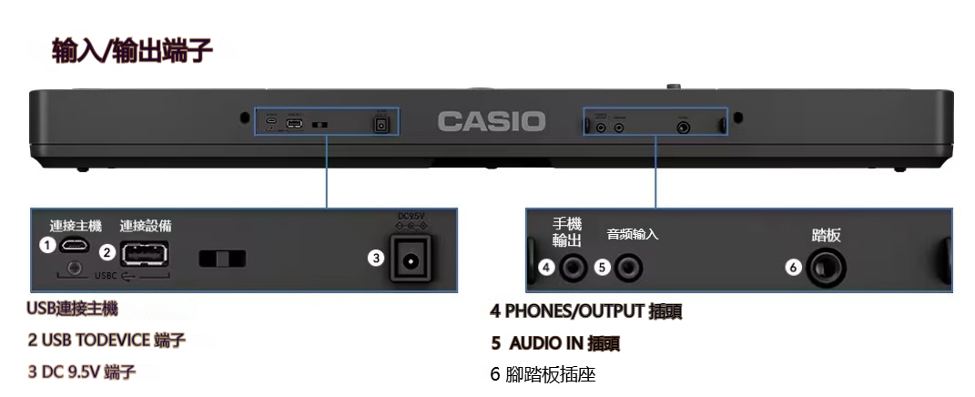 連接埠:USB micro B (連接電腦/智慧裝置)、USB Type A (連接藍牙接收器 WU-BT10)、音源輸入插孔、耳機/輸出插孔、延音踏板插孔