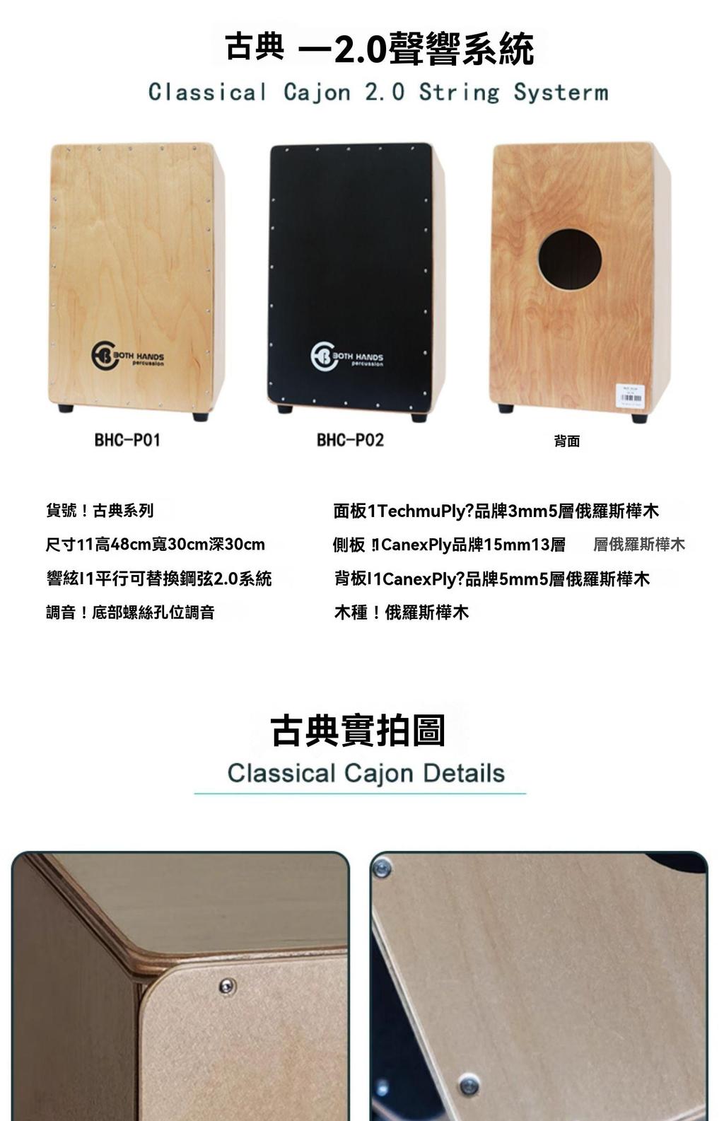 Both Hands Classical Cajon 古典系列木箱鼓採用 2.0 聲響系統與多層樺木結構,聲音表現平衡且耐用,適合居家練習、教學與演出使用。經典外型搭配穩定手感,是入門與進階玩家都能安心選擇的節奏樂器。