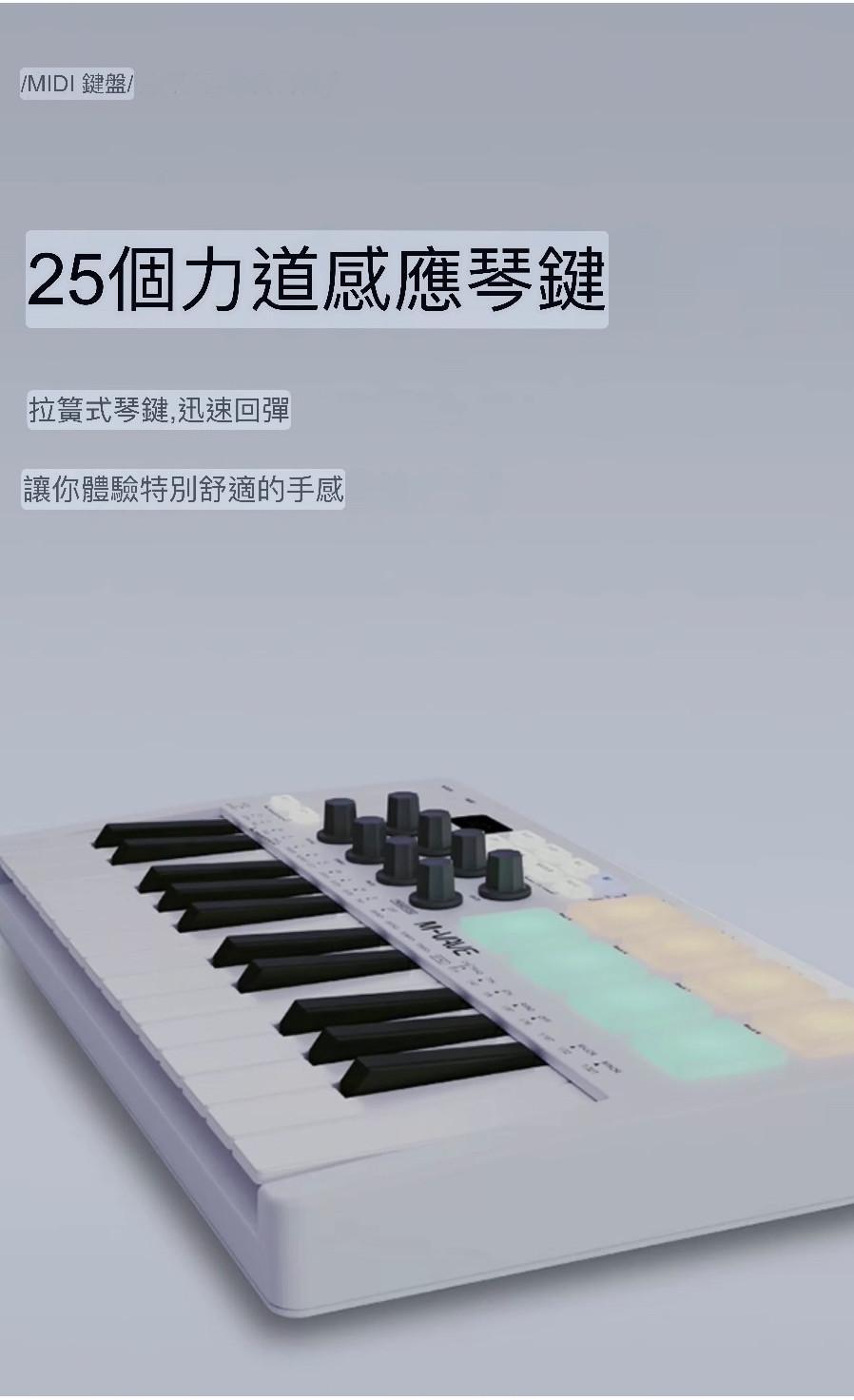 採用 25 鍵力度感應琴鍵,回彈速度佳,適合旋律輸入與即時演奏。