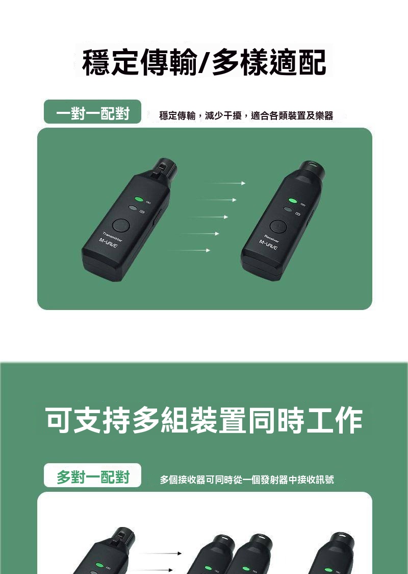 使用前請先確認發射器與接收器已完成配對並電量充足,再進行正式使用。建議在演出或錄音前先測試連線距離與環境干擾情況,以確保穩定傳輸。連接或拆卸時請輕柔操作 XLR 接頭,避免拉扯造成損壞。使用完畢後建議關閉電源並定期充電,以延長電池壽命。適合舞台演出、教學、直播與錄音等多種應用情境。