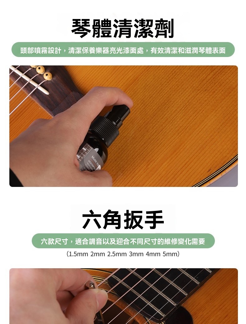 維修保養/清潔護理: 🧼 適用於日常清潔指板、琴身拋光,以及更換琴弦、調整弦距等基本維護。