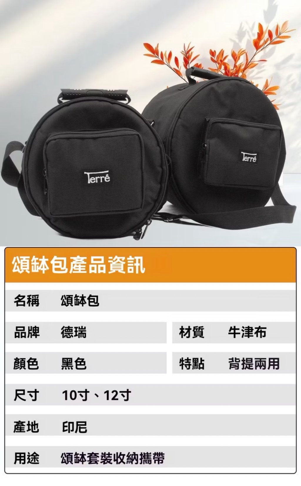 Terré 德瑞12吋鼓包 頌缽包 尼龍黑色 可手提/肩背 樂器配件